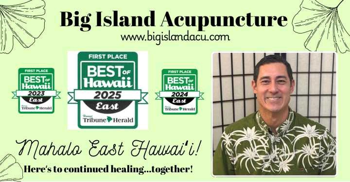 Located at 82 Keaʻa Street in beautiful Hilo, Hawaii, Big Island Acupuncture is honored to have been recognized as East Hawaii's Best Acupuncture for three consecutive years 2023, 2024 and 2025. Mahalo to our community for your continued trust and support!